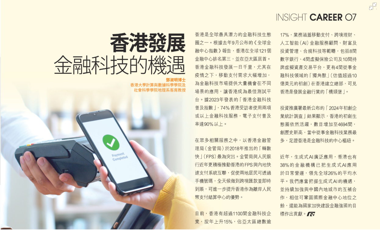 近年,生成式AI廣泛應用,香港也有38%的金融機構已把生成式AI應用於日常營運,領先全球26%的平均水平。我們應當把握生成式AI的機遇,並持續加強與中國內地城市的互補合作,相信可鞏固國際金融中心地位之餘,還能為國家加快建設金融強國的目標作出貢獻。