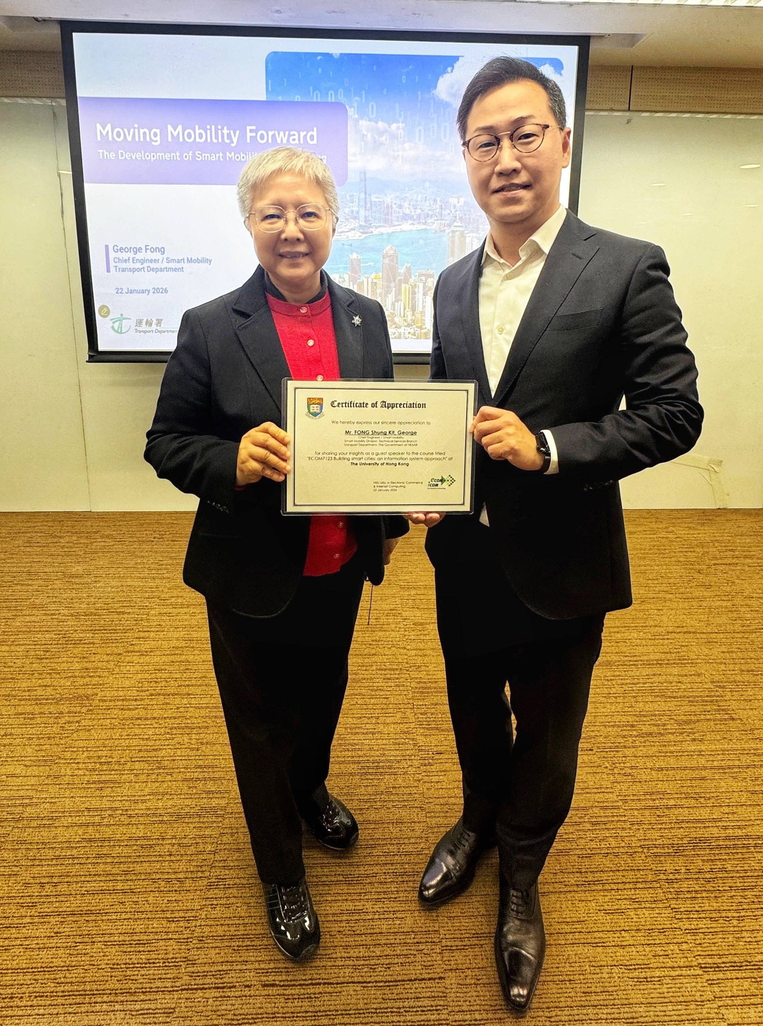 今晚很高興能夠連續第三年邀請到運輸署技術服務科智慧出行部總工程師方崇傑先生和他的團隊到來我的課堂,和我們分享香港智慧出行的發展及相關措施的成效。隨著科技不斷進步,當6G、 衛星導航、三維地圖空間數據等深度融合和廣泛應用之後,我相信未來的智慧出行將會有更多突破性發展,為市民提供更多元的智慧出行選項。
