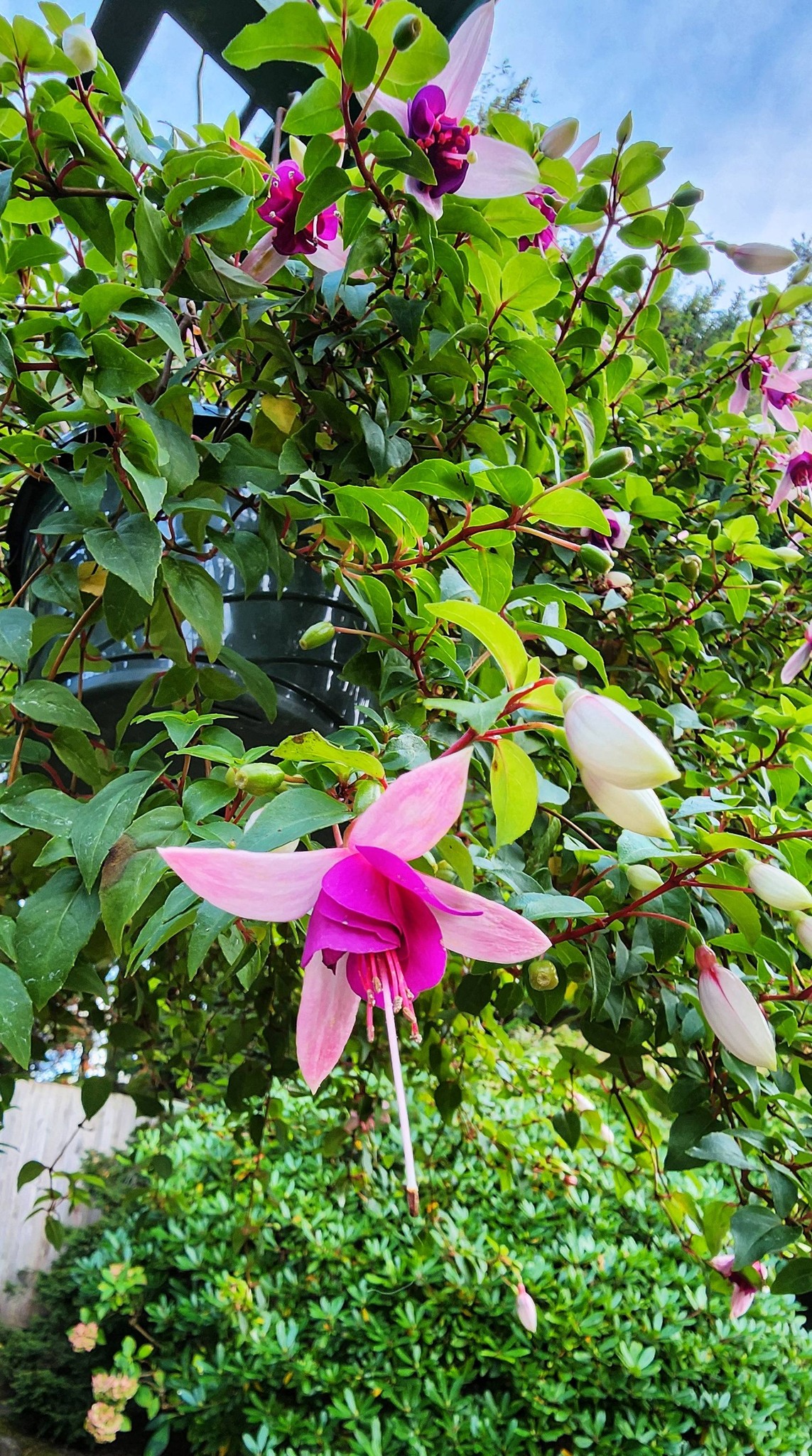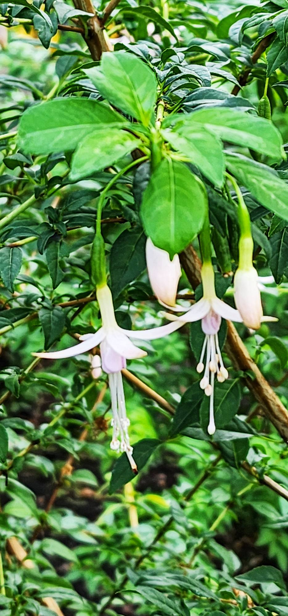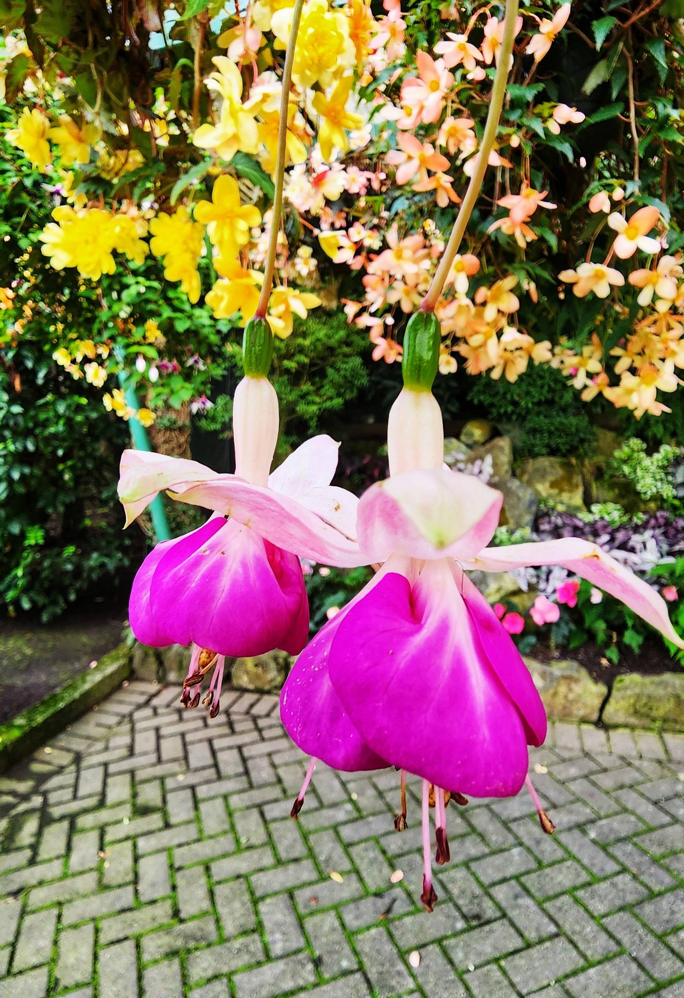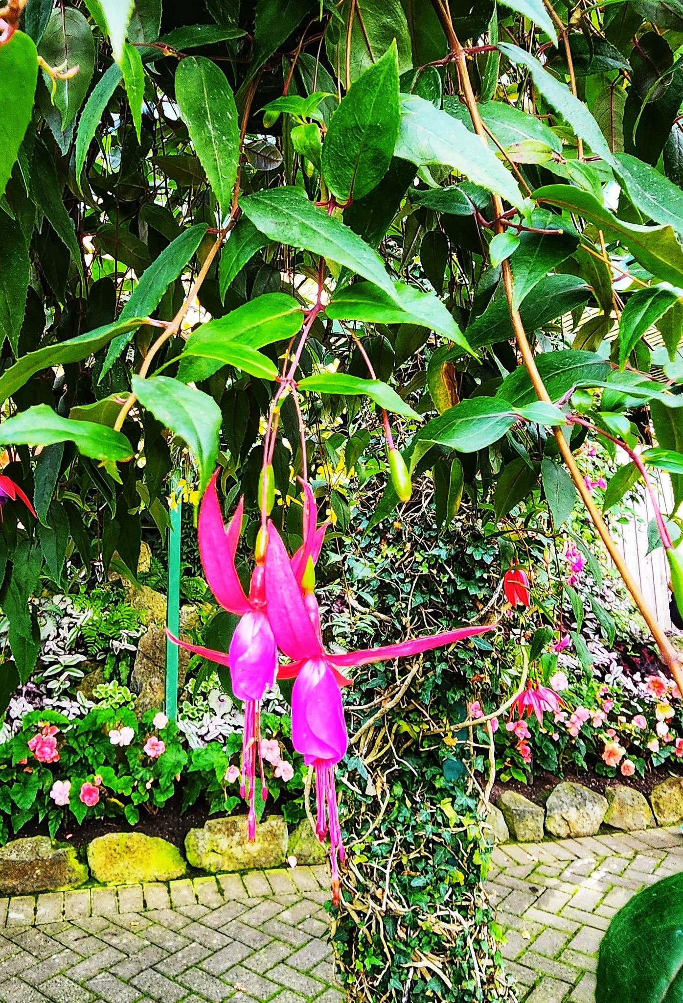 倒掛金鐘(Fuchsia),又名吊鐘花,花色變化多姿,包括粉紅、紫紅、白色和混合雙色,又分單瓣和複瓣,花型千姿百態,有鐘狀、花萼向後翻起和細長管狀等,種類逾百,花期跨越冬季及春季,是極具觀賞價值的庭園植物。