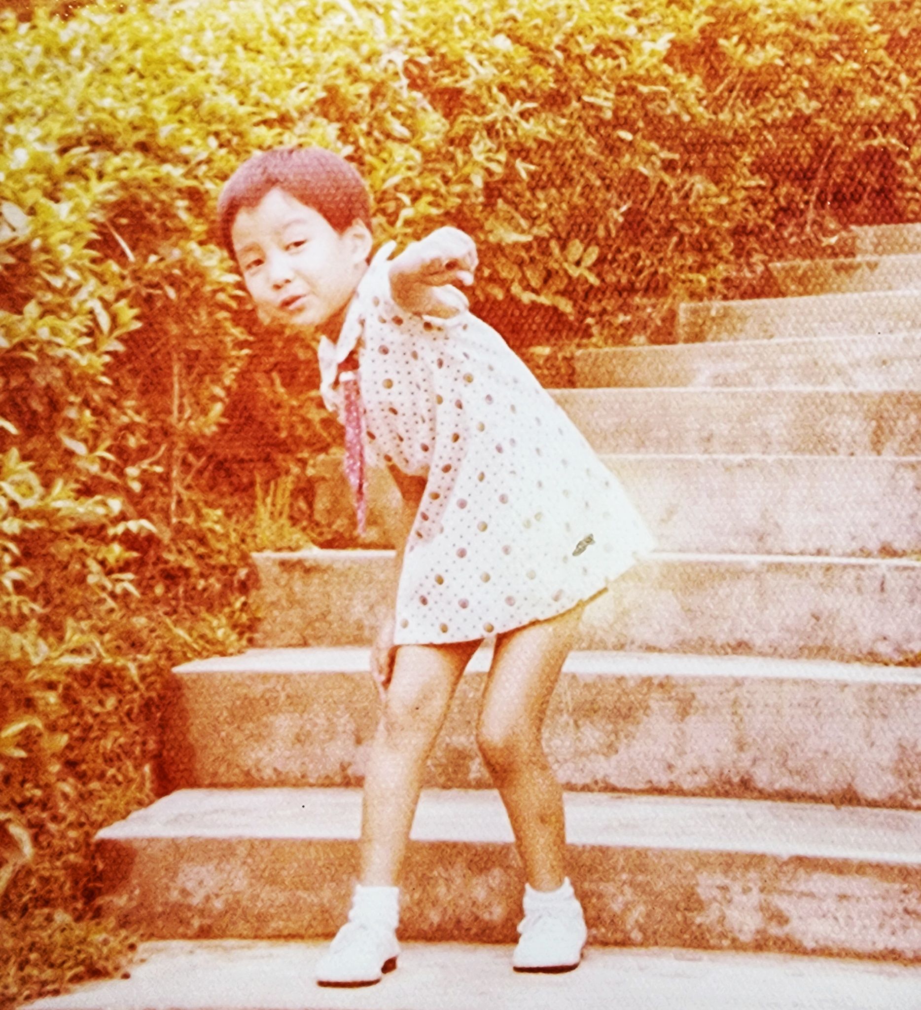 童年時代的我沒有近視,不用帶眼鏡,愛跳石級及接觸大自然,也時常手舞足蹈蹦蹦跳跳,從這半世紀的發黃相片所見,她可能是被「GIS」耽誤了的女團成員。