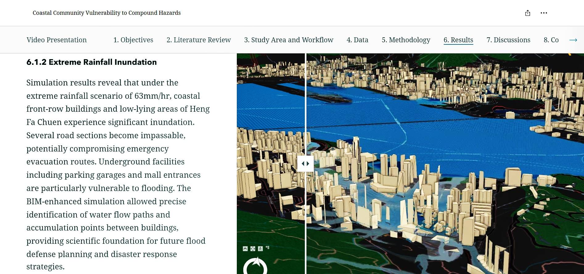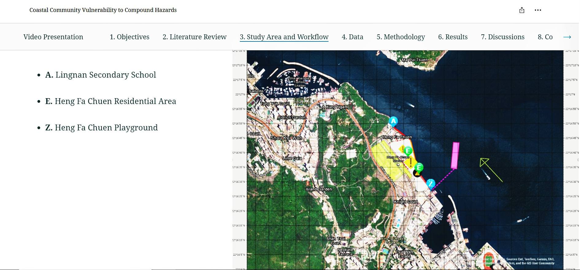 這個題為《複合型災害下沿海社區的脆弱性評估》(Coastal Community Vulnerability to Compound Hazards)的研究,以GIS結合多元資訊,如地形資料、香港天文台及歐洲中期天氣預報中心(ECMWF)的數據等,構建了3D GIS洪水動態可視化模型,模擬洪水場景,從而識別高危區域。研究顯示杏花邨有多個防災弱點,建議加固海堤、改良排水系統,並推行社區災害預警措施。研究能為本港未來的颱風防禦及緊急應變提供科學依據,因而獲得「Esri青年學人大獎2025」最佳團體項目及最佳3D GIS應用的殊榮。