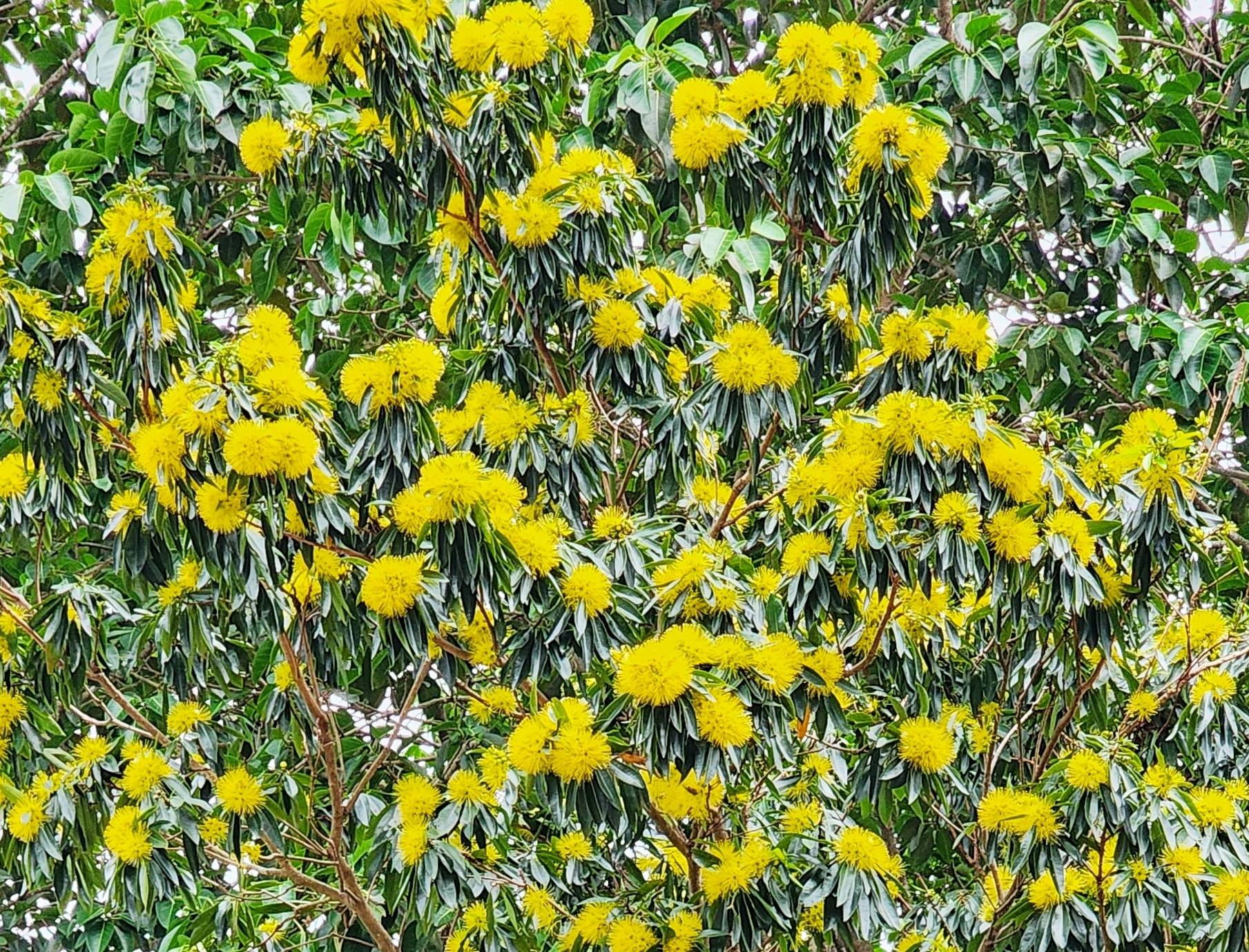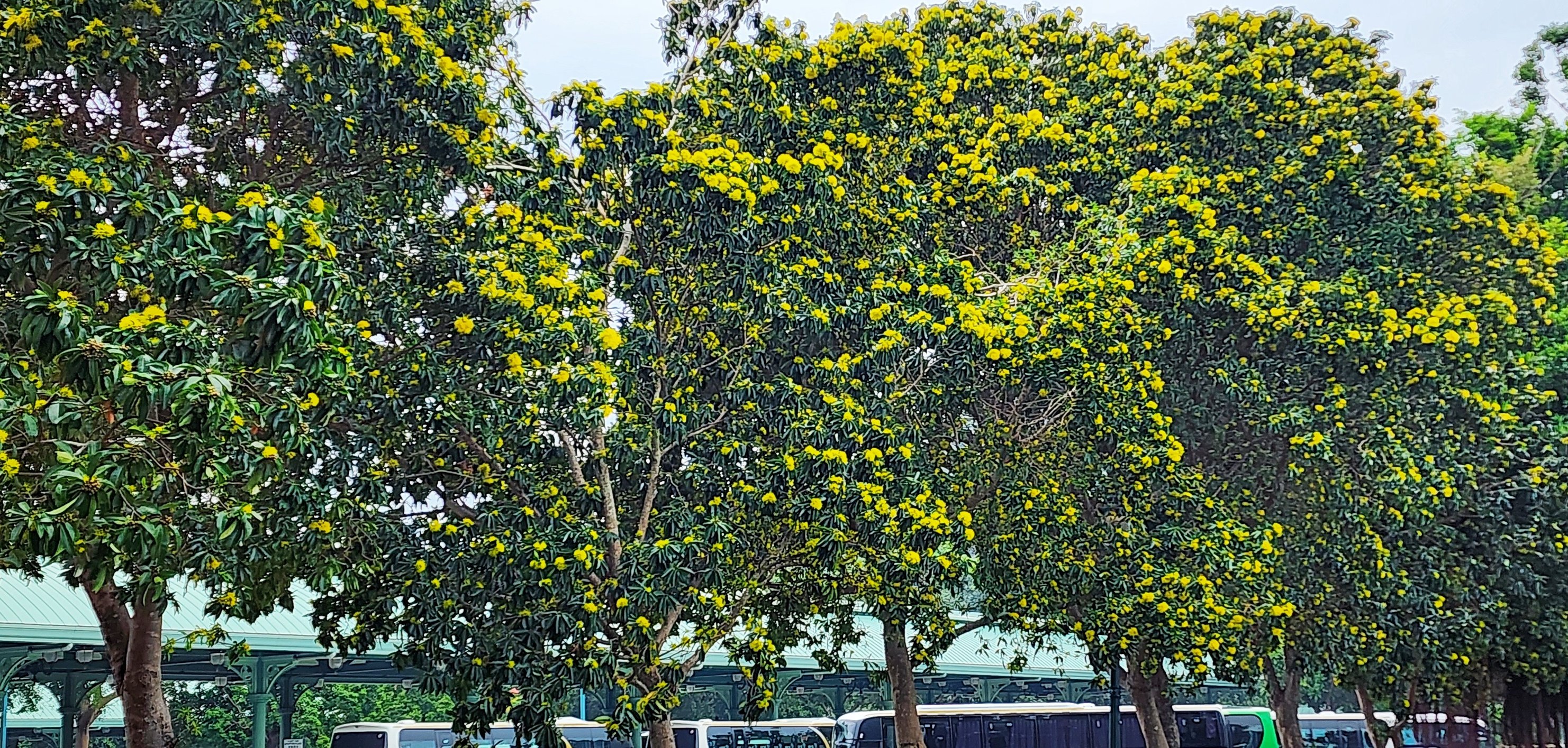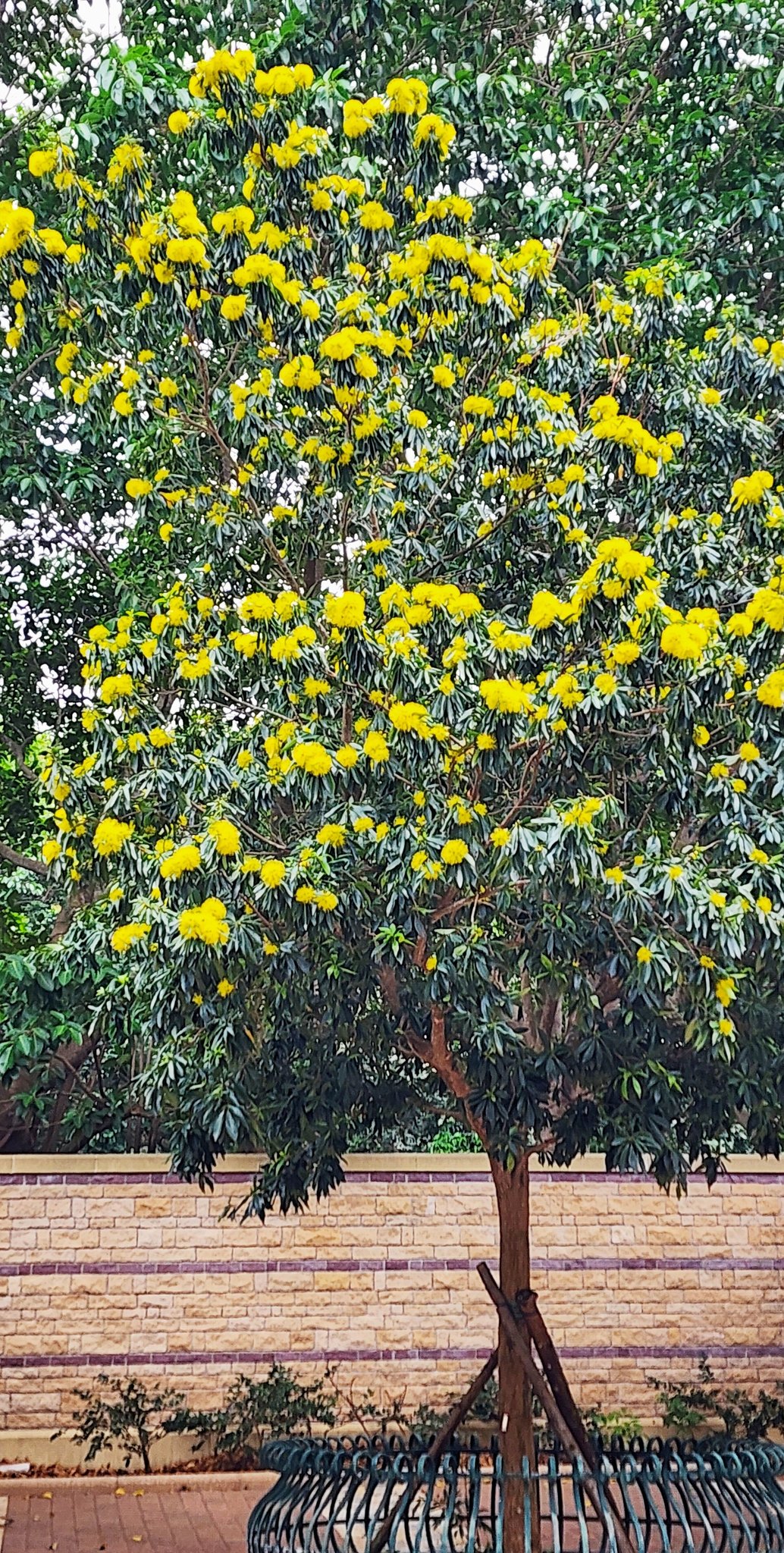 金蒲桃源自澳洲,是常錄喬木,它的花序排列成半球體,遠看就如運動會啦啦隊揮動的草球。還記得中學開運動會時,從看台望到街上金光璀璨的金蒲桃,它們隨風搖晃的動態,就像和草地上的啦啦隊互相呼應一樣,令人印象深刻!