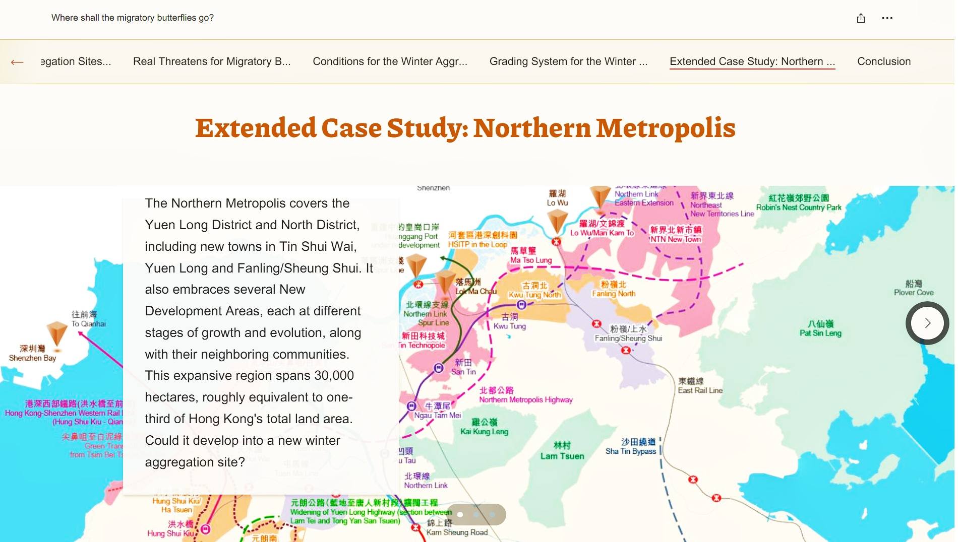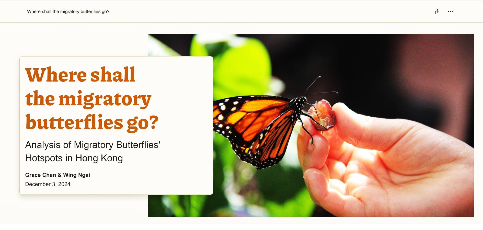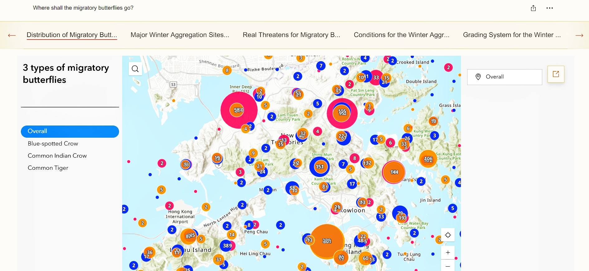 她們以本港七個熱門的蝴蝶聚集地如香港公園、深水灣谷等為研究對象,運用GIS分析各地的特徵,指出地形、氣候、陸地分佈、日照及人類行為明顯影響蝴蝶遷徙的情況,建議當局善用數據以追蹤蝴蝶遷徙的模式及路線,從而定出有助生態可持續發展的方案。研究特別以互動地圖清晰顯示本港最常見的藍斑青鳳蝶、幻紫斑蛺蝶及金斑蝶在港的分佈位置,因而獲得「Esri青年學人大獎2025」團體組的「最佳互動地圖儀表板應用」奬項。