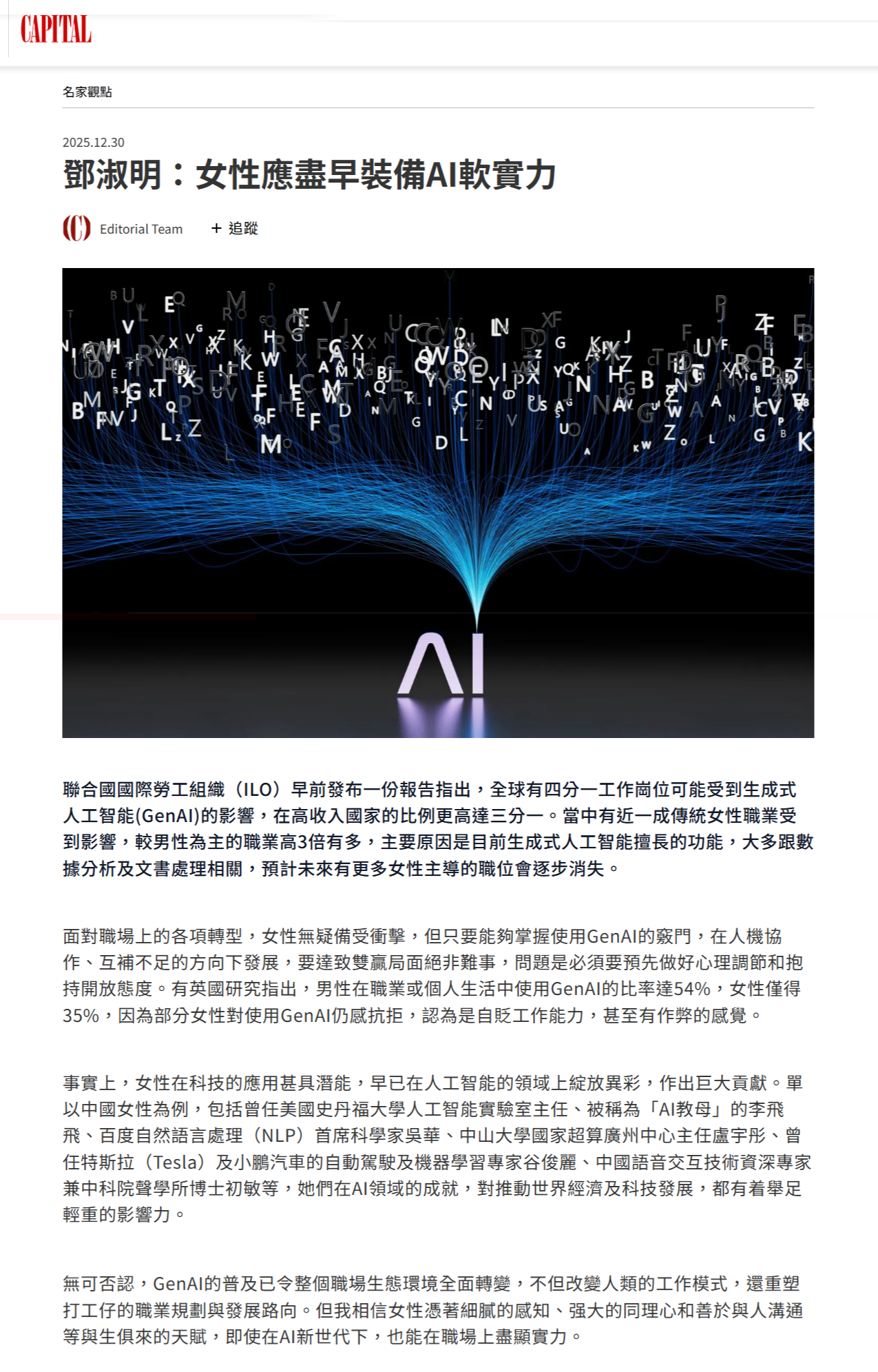 無可否認,GenAI的普及已令整個職場生態環境全面轉變,不但改變人類的工作模式,還重塑打工仔的職業規劃與發展路向。但我相信女性憑著細膩的感知、强大的同理心和善於與人溝通等與生俱來的天賦,即使在AI新世代下,也能在職場上盡顯實力。