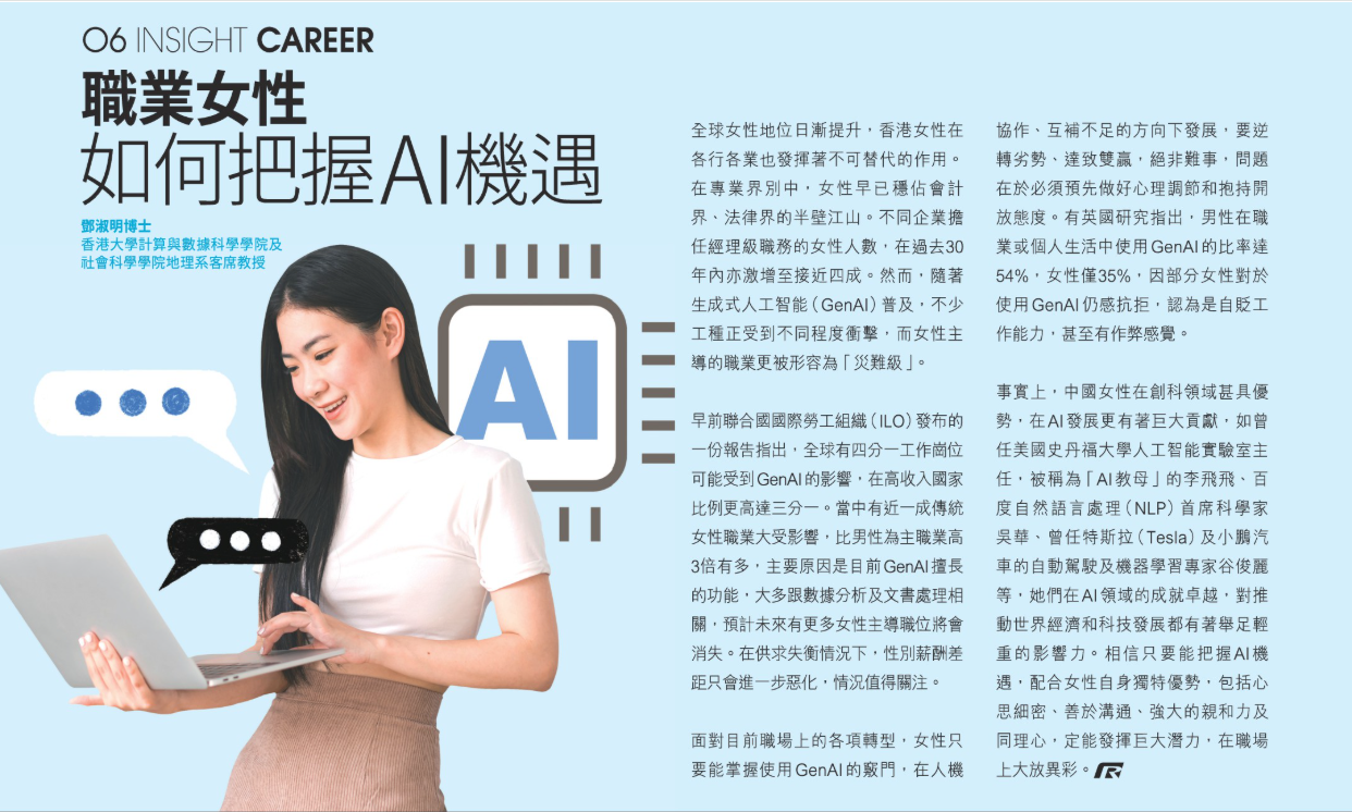 事實上,中國女性在創科領域甚具優勢,在AI發展更有著巨大貢獻,如曾任美國史丹福大學人工智能實驗室主任,被稱為「AI教母」的李飛飛、百度自然語言處理(NLP)首席科學家吳華、曾任特斯拉(Tesla)及小鵬汽車的自動駕駛及機器學習專家谷俊麗等,她們在AI領域的成就卓越,對推動世界經濟和科技發展都有著舉足輕重的影響力。相信只要能把握AI機遇,配合女性自身獨特優勢,包括心思細密、善於溝通、強大的親和力及同理心,定能發揮巨大潛力,在職場上大放異彩。