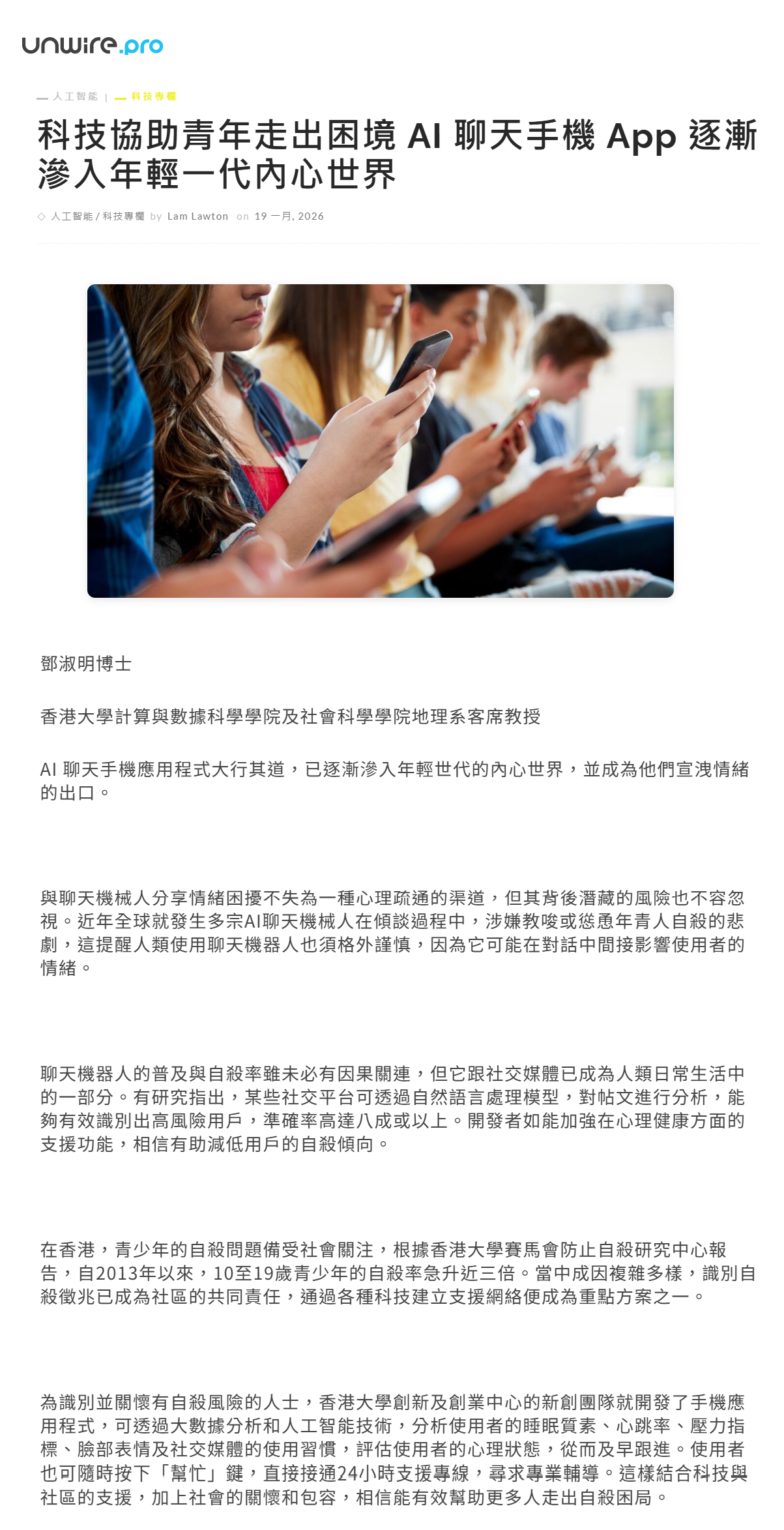 在香港,青少年的自殺問題備受社會關注,根據香港大學賽馬會防止自殺研究中心報告,自2013年以來,10至19歲青少年的自殺率急升近三倍。當中成因複雜多樣,識別自殺徵兆已成為社區的共同責任,通過各種科技建立支援網絡便成為重點方案之一。