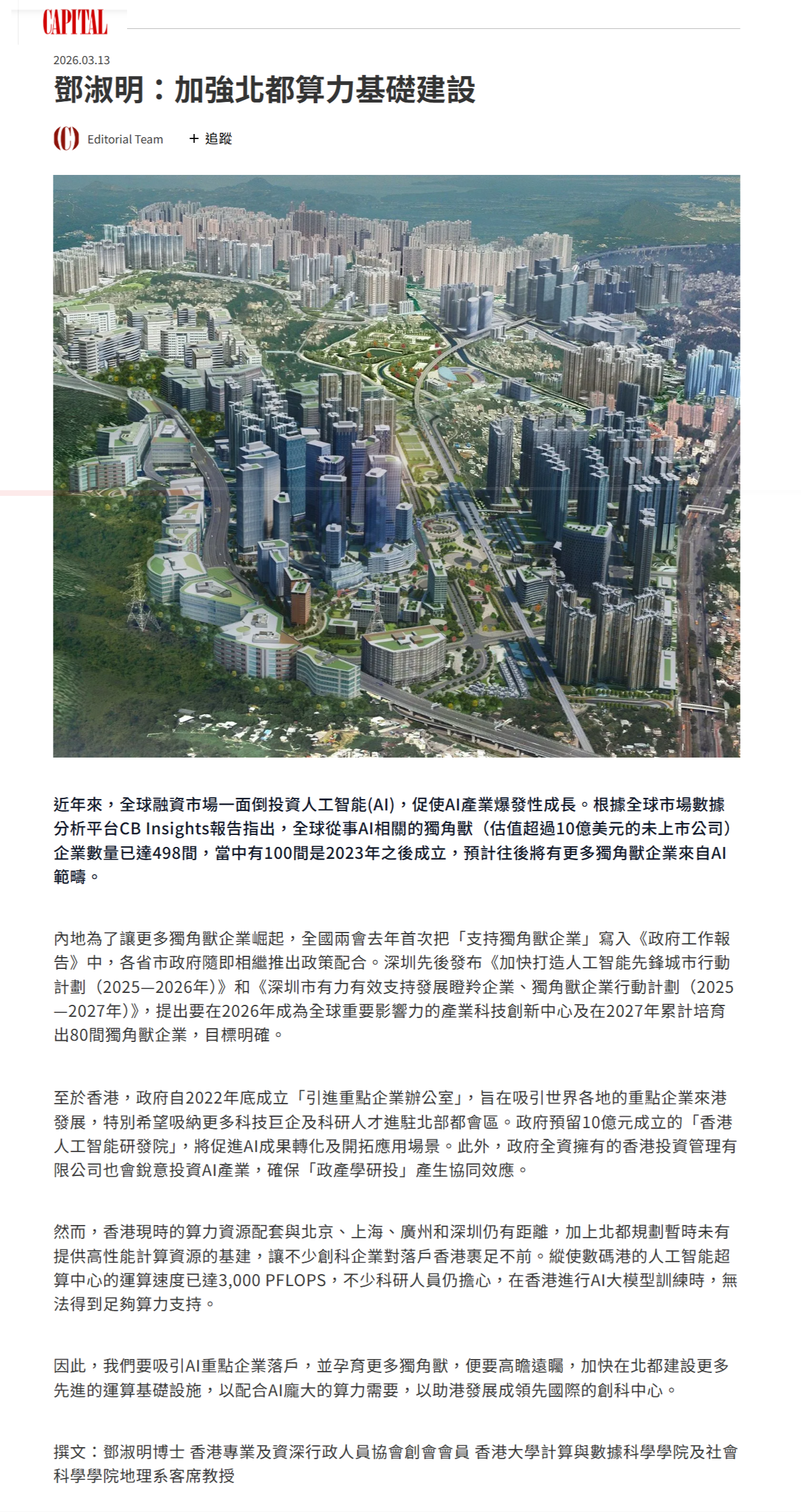 因此,我們要吸引AI重點企業落戶,並孕育更多獨角獸,便要高瞻遠矚,加快在北都建設更多先進的運算基礎設施,以配合AI龐大的算力需要,以助港發展成領先國際的創科中心。