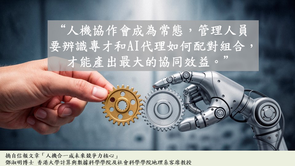 Gartner預測,到2028年,15%的日常工作決策將由具自主能力的AI系統直接作出。因為人機協作會成為常態,管理人員要辨識專才和AI代理如何配對組合,才能產出最大的協同效益。職場人士要在AI代理時代突圍而出,除要審視本身的工作性質,全面重塑工作流程和思維模式,還須增强三大基本核心能力—精準的提問能力、判斷力,以及掌握行業上的專業深度,才能充分發揮AI代理的潛能,為人機協作創造更多無限可能。