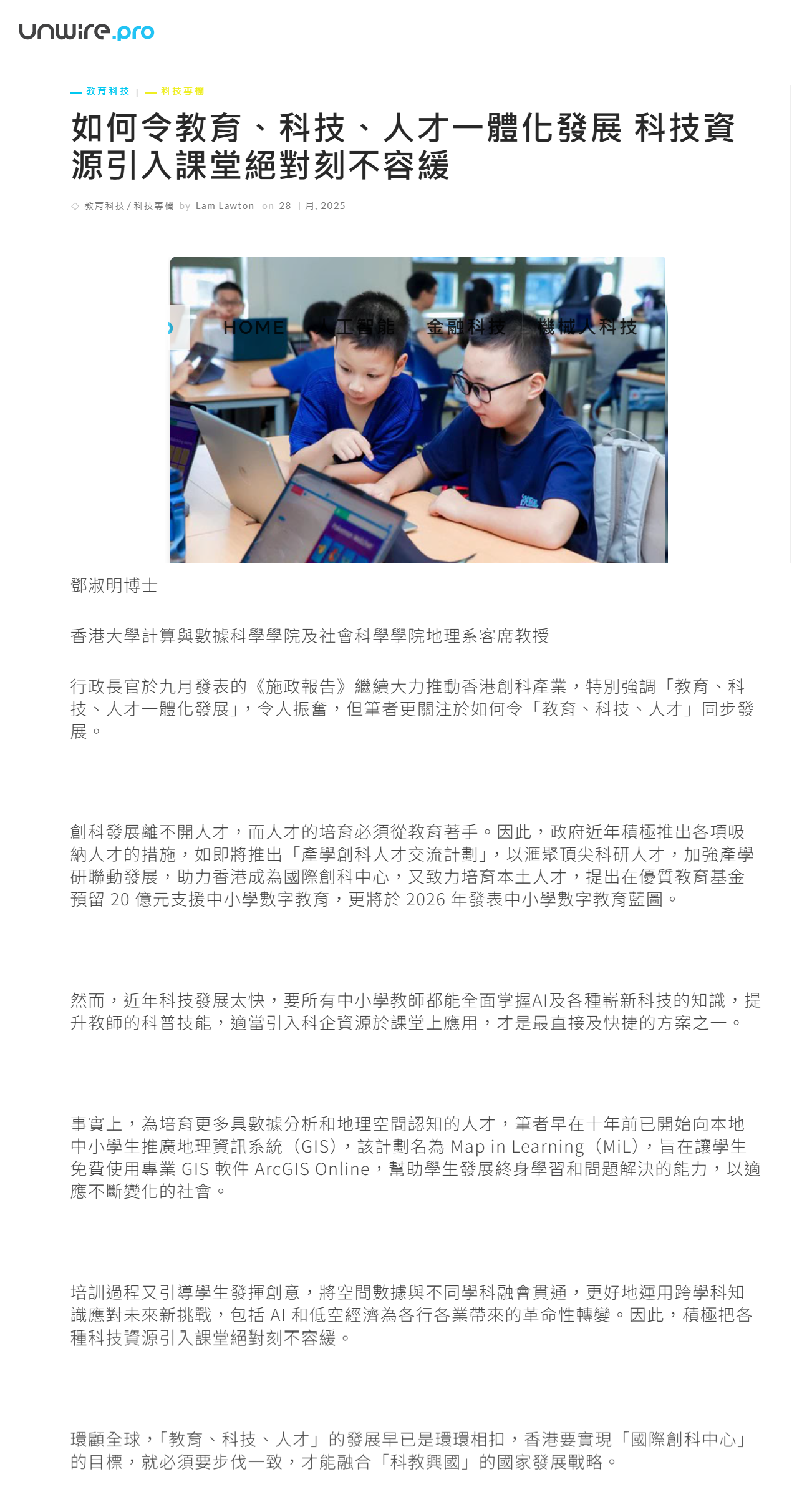 事實上,為培育更多具數據分析和地理空間認知的人才,筆者早在十年前已開始向本地中小學生推廣地理資訊系統(GIS),該計劃名為 Map in Learning(MiL),旨在讓學生免費使用專業 GIS 軟件 ArcGIS Online,幫助學生發展終身學習和問題解決的能力,以適應不斷變化的社會。