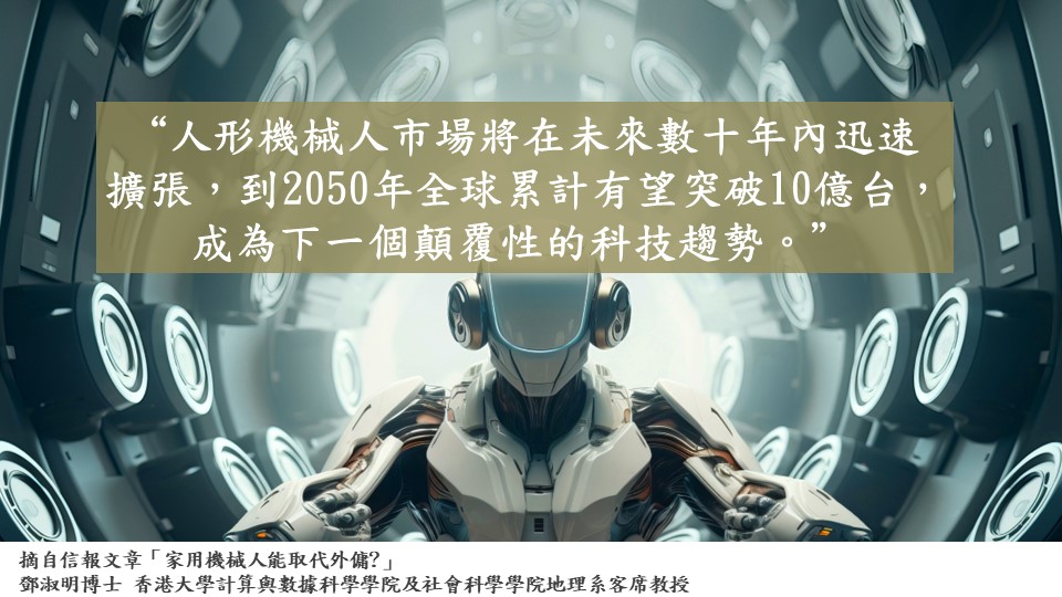 人形機械人的發展日趨成熟,其設計已非常人性化,既可支援複雜的對話,又可以行走及交互功能。隨著全球積極投入研發,相信人形機械人市場將在未來數十年內迅速擴張,摩根士丹利有報告便預計,到2050年全球人形機械人的銷售有望突破10億台,它將成為下一個顛覆性的科技趨勢。 想了解更多內容,請到以下連結閱讀我在信報刊登之最新文章: https://winnietang.hk/tc/ArticleDetail/12716/?pageid=1030