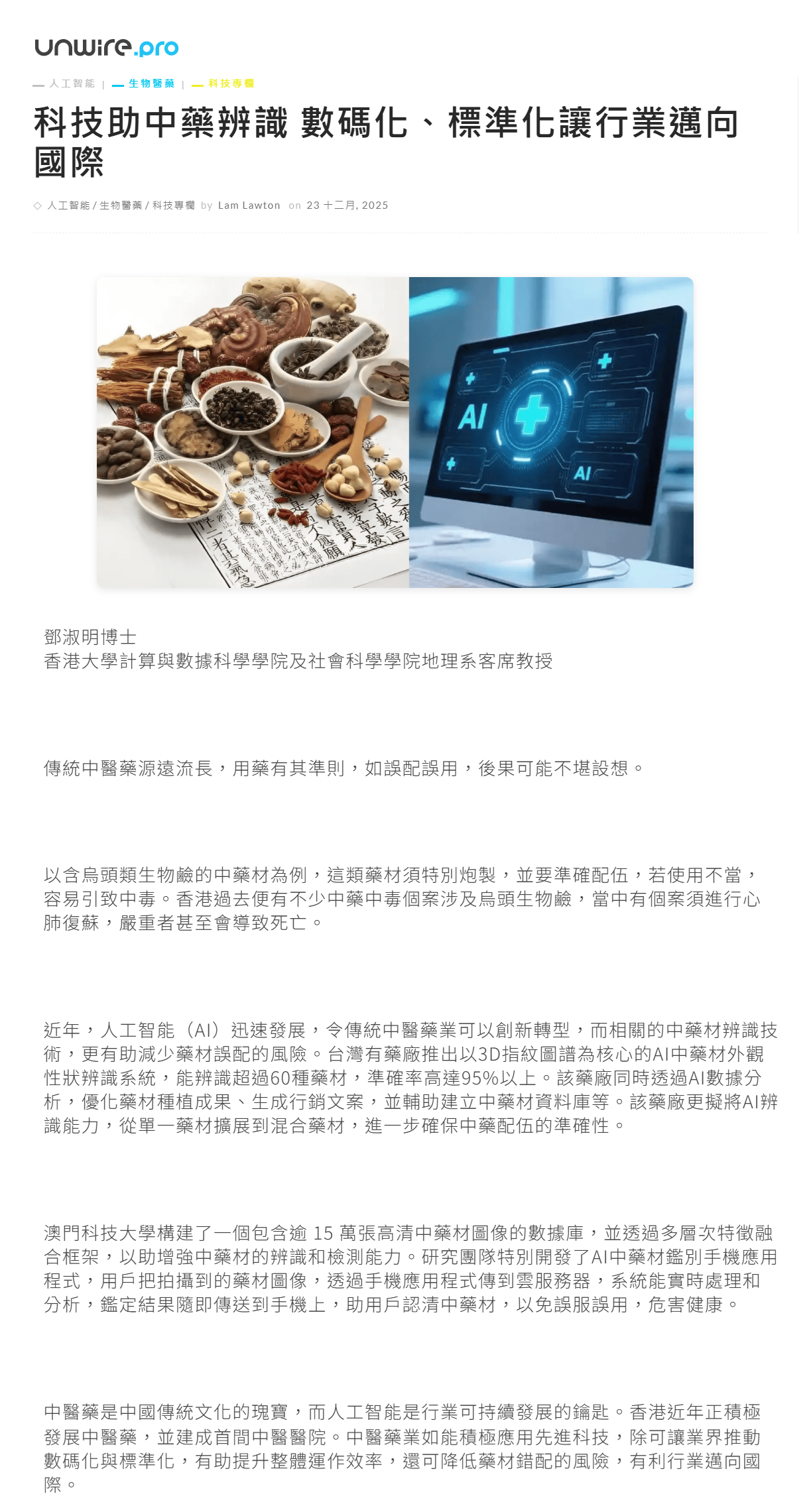中醫藥是中國傳統文化的瑰寶,而人工智能是行業可持續發展的鑰匙。香港近年正積極發展中醫藥,並建成首間中醫醫院。中醫藥業如能積極應用先進科技,除可讓業界推動數碼化與標準化,有助提升整體運作效率,還可降低藥材錯配的風險,有利行業邁向國際。