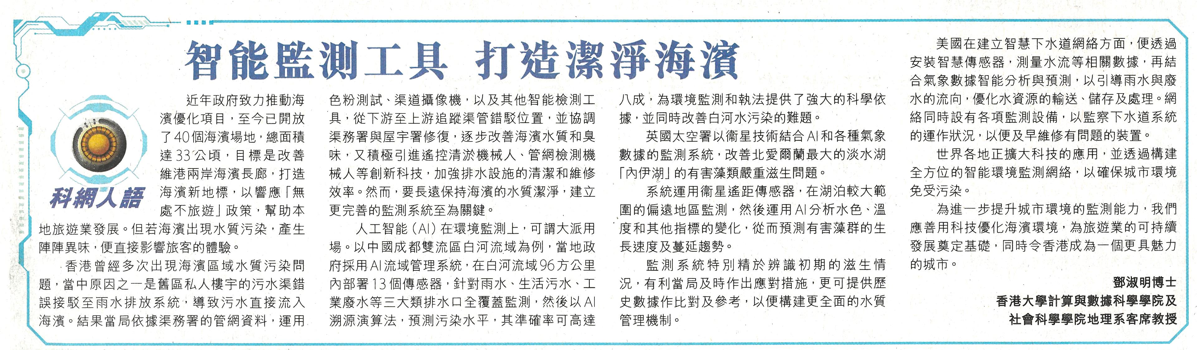 香港曾經多次出現海濱區域水質污染問題,當中原因之一是舊區私人樓宇的污水渠錯誤接駁至雨水排放系統,導致污水直接流入海濱。結果當局依據渠務署的管網資料,運用色粉測試、渠道攝像機,以及其他智能檢測工具,從下游至上游追蹤渠管錯駁位置,並協調渠務署與屋宇署修復,逐步改善海濱水質和臭味,又積極引進遙控清淤機械人、管網檢測機械人等創新科技,加強排水設施的清潔和維修效率。然而,要長遠保持海濱的水質潔淨,建立更完善的監測系統至為關鍵。